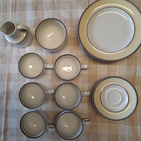 Arabian Veranda-kahviastiasto, johon kuuluu kahdeksan korvallista kahvikuppia, niihin sopivia aluslautasia, sokerikko sekä kermakko. Astiat ovat valkoista keramiikkaa, sisäpinnoiltaan vaaleankeltaisia ja tummalla raidalla reunustettuja. Sopii kahvi- tai teehetkiin kotikäyttöön tai kattauksen täydentämiseen samaa sarjaa olevien muiden astioiden kanssa. Asiat ovat käyttämättömiä/uusia. Myydään settinä.