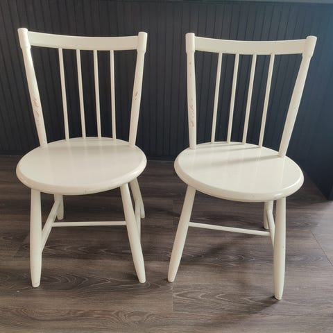 Annetaan korjausta vaativat pinnatuolit. Kaikki vaativat liimausta ja uuden maalin. Yhdestä selkänojan pinna katki. Annetaan vain kaikki kerralla.
