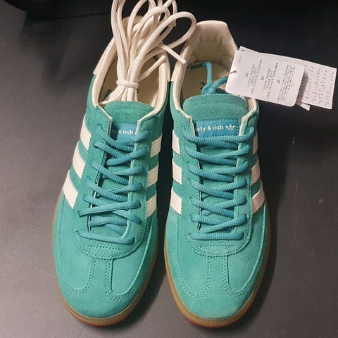 Uudet ja käyttämöttämät Adidas Handball Spezial tennarit, koko 38 2/3. Värinä beige päällinen vaaleansinisillä raidoilla ja ruskea kumipohja. Nauhakiinnitys. Päällinen mokkanahkaa, kuminen ulkopohja tarjoaa pidon. Itselle isot, joten myyntiin🤍