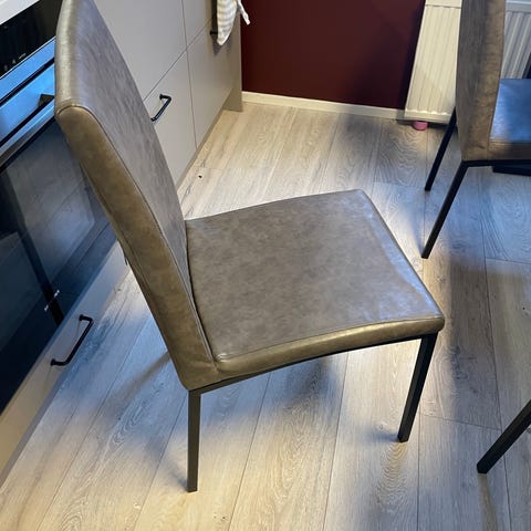 Kolme ruokapöydän tuolia, kahden tuolin alta kangas lähtenyt repeilemään, muttei vaikuta ulkonäköön tai käyttöön.