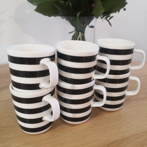 Marimekon tasaraita muki Oiva, punavalkoinen. 5kpl. Vetoisuus 2,5dl.