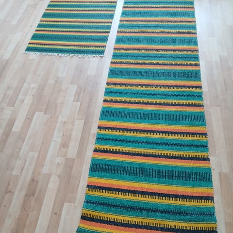 Siisti ja kestävä ja helposti pestävä muovimatto (tehty PVC nauhasta). On käytetty mutta eipä sitä juuri huomaa. Tämä on "Pappelina" tyyppinen mutta ei ole Pappelinan valmistama. Katso kuvat tarkkaan, tän tyyppisissä matoissa reunat eivät ole absoluuttisen suorat koska kudontamateriaali joustaa. Saa tulla katsomaan ennen kuin tekee ostopäätöksen. Postitan pienemmässä paketissa taitettuna, mutta jos haluat voin lähettää isommassakin rullattuna. Nämä kyllä yleensä suorenee käytössä ja lämpimällä vedellä kastellessa.