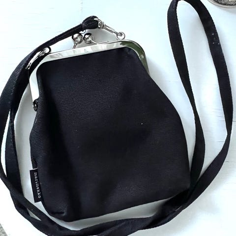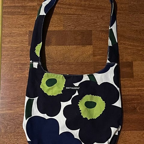 Marimekon olkalaukku, jossa metallinen kehys ja nipsulukko. Sopii esim. puhelimen ja pienten tavaroiden kuljettamiseen.