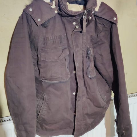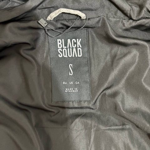 Black Squad talvitakki miehille, koko S. Väriltään beige, kauttaaltaan logokuvioitu pinta. Takissa on etupuolella useita taskuja ja edessä vetoketju sekä mahdollisesti nepparikiinnitys (kuvien perusteella). Sisäpuoli on tummansävyinen ja topattu, tarkoitettu kylmempiin säihin. Materiaalista ei ole tarkkaa tietoa, mutta kyseessä on keinokuituinen, lämpöä eristävä talvitakki arkikäyttöön.