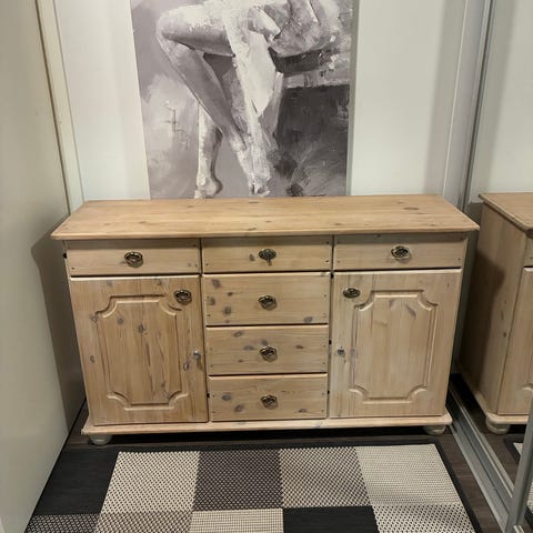Valkoiseksi maalattu senkki / lipasto. Osa laatikoista eri sävyisiä kuin itse lipasto. Alunperin ollut ruskea.