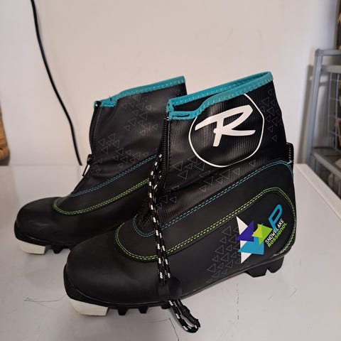 Karhu Sport ja Rossignol lasten hiihtomonot. Karhu Sport -monot ovat mustat, joissa on vetoketjullinen päällinen ja nauhakiinnitys alla. Rossignol-monot ovat mustat, sisäpuolelta valkoiset ja lämpimästi vuoratut, koko 34. Toinen pari on kokoa 35. Molemmat parit soveltuvat lasten maastohiihtoon. Pohjat on suunniteltu käytettäväksi yleisimpien lasten maastohiihtositeitä vastaavien järjestelmien kanssa. NNN. 20e Pari.