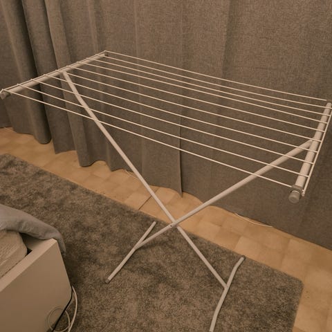 Metallinen pyykinkuivausteline, väri musta. Teline on kokoontaitettava ja vie vähän tilaa säilytyksessä.