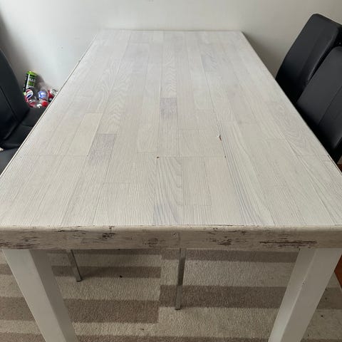 Annetaan jatkettava ruokapöytä, on ollut työhuonekäytössä. Paljon käytön jälkiä. Jalat puuta, kansi - mdf. Pöydän jalat saa irrotettua kuljetuksen helpottamiseksi.