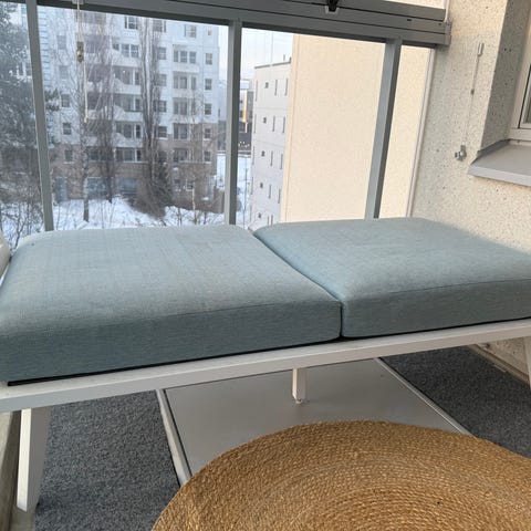 ✨Tokmannista ostettu parvekesohvaryhmä, johon kuuluu kaksi käsinojallista nojatuolia, kaksipaikkainen sohva sekä pyöreä pöytä. Rungot ovat mustaa metallia ja käsinojat puuta. Istuimissa ja selkänojissa on harmaat pehmusteet, ja selkänojat ovat nauhamaisesti punottua metallia tai muovia. Pöydässä on pyöreä, tumma kansi ja metallijalat. Sopii parvekkeelle tai terassille istuskeluun ja oleskeluun useammalle hengelle.