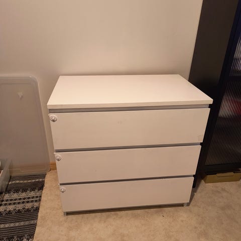 Ikean valkoinen lipasto, muuten hyvässä kunnossa mutta parista välistä irronnut "lista" tai mikän onkaan. Kts kuva.