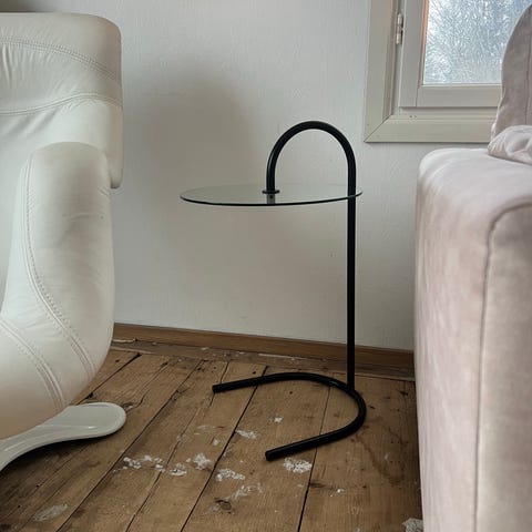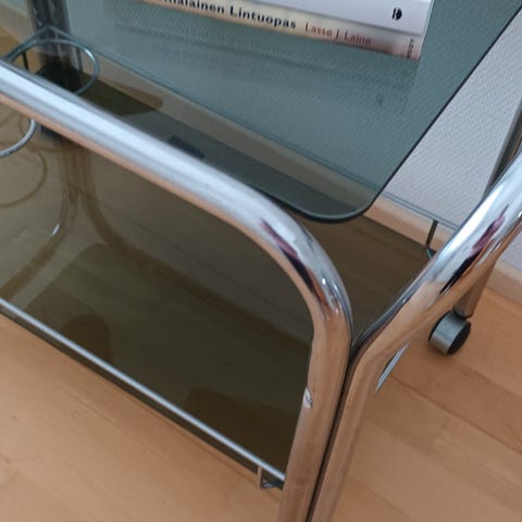 Tämä monikäyttöinen huonekalu on valmistettu nikkelöidystä teräksestä ja valkoisesta karkaistusta lasista. Siinä on kaksi pyöreää tasoa ja alla rullat, joiden ansiosta sitä on helppo siirtää.