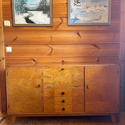 Upea 50 luvun senkki, jossa avautuva hylly ja kaappilokero. Tason pinta hieman kärsinyt, koska on vanha senkki.