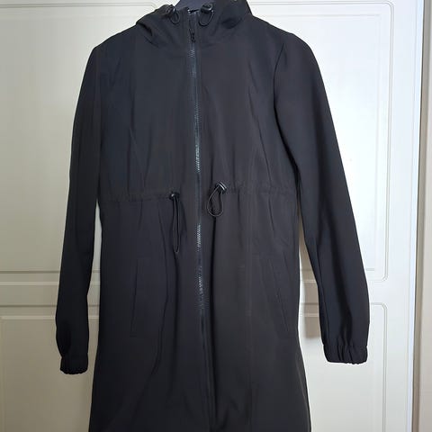 Talvitakki, jossa kantopaneeli vauvaa varten. Toisen taskun sisäsauma ratkennut, ei näy ulospäin. Sivussa vetoketjut. Väri on musta, kuva vääristää