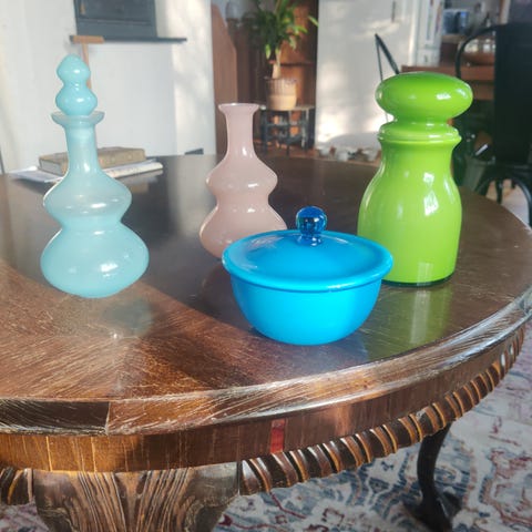 Italialais valmisteiden vihreän sävyinen koriste pullo joka tehty muistuttamaan maito pulloa. Pullon toisella sivulla teksti absolutely pure milk ja pohjassa made in italy. Pullon korkeus 28 cm kunto hyvä. Mukaan 6 kpl saman väristä vihreää lasia olevat käyttämättömät juomalasit metallisessa kanto telineessä. Lasien korkeus 9 cm. Telineen mitat pituus 31 ja leveys 21 cm.