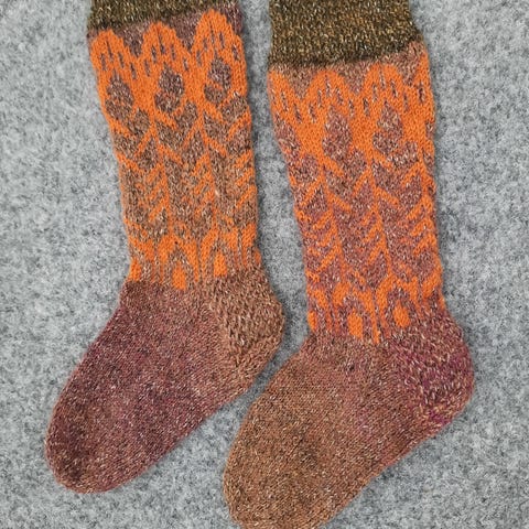 Käsin neulotut pitkävartiset villasukat kirjoneuletta. Sukat ovat uudet ja käyttämättömät, ei tupakointia eikä lemmikkieläimiä.