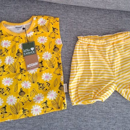 Muumi kesähattu. Tummentumaa ja tahraa löytyy. Kokolappua en löytänyt mutta noin 1-2 v. Sopii