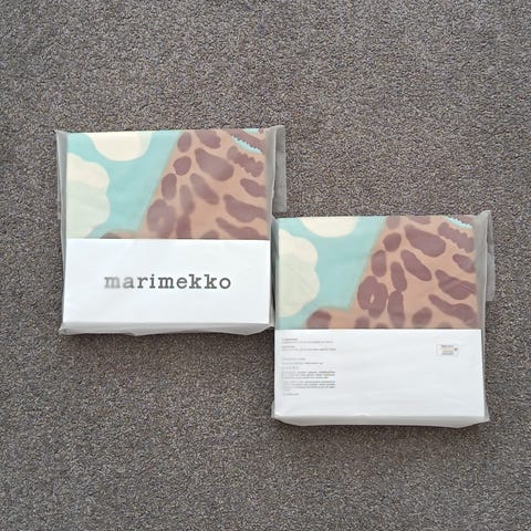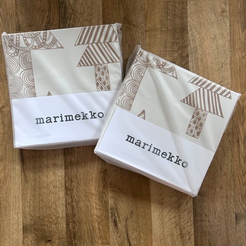 Marimekko Kaksoset-sarjan pussilakanasetti, joka sisältää pussilakanan 150x210 cm ja tyynyliinan 50x60 cm. Väri greige (beige/harmaa). Uusi ja avaamaton paketti, löytyy 2 settiä. Hinta 100 euroa / setti.