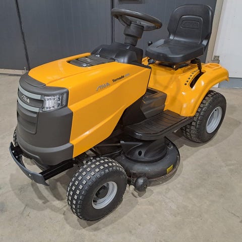 Stiga Tornado 3108 H ajoleikkuri. Polttomoottorikäyttöinen ruohonleikkuri, jossa on kuljettajan istuin ja ohjauspyörä. Leikkurissa on keltainen runko ja mustat yksityiskohdat. Mallimerkinnän mukaan koneessa on hydrostaattinen vaihteisto (Hydro-Gear). Soveltuu nurmialueiden leikkaamiseen ja pihan hoitoon.