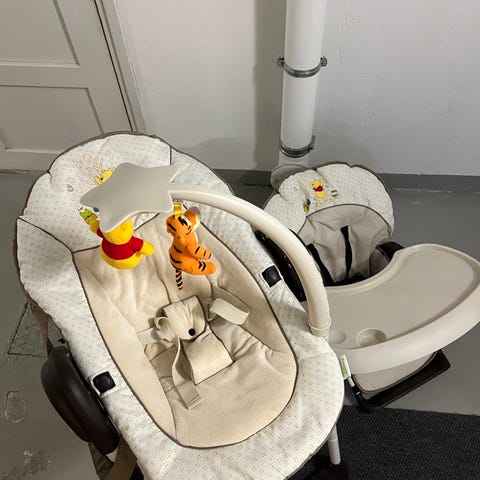 Winnie the pooh kiva syöttötuoli. Kuvissa ei näy mutta sillä on lisäosa kori. Todella tilava kori kankaasta, kiinnittyy alas jalkoihin.