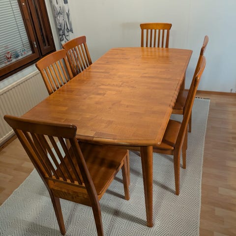 2019 Nettikalusteesta ostettu Julia 4hlö ruokailuryhmä. Pöydän kannessa ollut muutaman vuoden puukuvioinen dc fix, mutta sen kun ottaa pois ruokailuryhmä on täysin valkoinen. Jaloissa on varmasti pieniä kolhuja (kuva), mutta tuolien kankaat on ehjät kauttaaltaan. 1 tuolin selkänoja on ns. löysempi kuin muut, mutta ei ole käyttöä haitannut.
