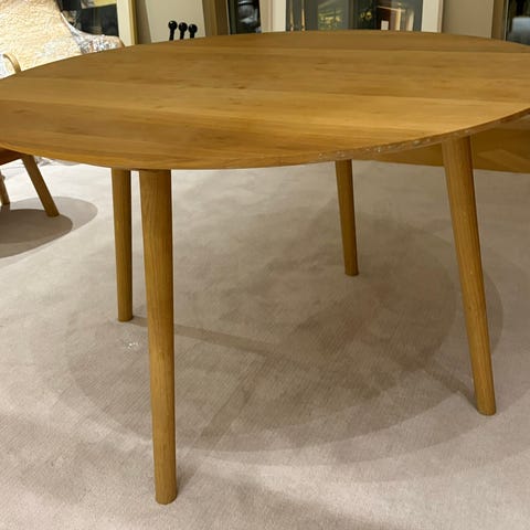 Tyylikäs ja ajaton pyöreä ruokapöytä (Ø110 cm) tumman tammen sävyssä. Selkeälinjainen design ja siro mutta tukeva rakenne. Sopii erinomaisesti 4 hengelle.