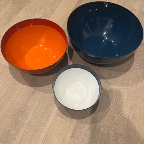 Heikki Orvolan Finelille suunnittelemat Emalia Armas uunivuoat. Halkaisija 27 cm kork 7 cm.