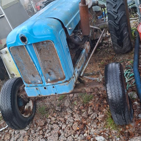 AI: Fordson Power Major traktori. Sininen, vanhemman mallinen maataloustraktori, jossa on etu- ja takavalot sekä takana kolmiopäinen nostolaite. Traktorissa on takapyörissä ketjut talvikäyttöä varten. Konepellin sivussa on Power Major -merkintä, ja moottoritila sekä sähkölaitteet näkyvät kuvissa. Takana on leveä aura-/lanteri, joka soveltuu esimerkiksi lumen tai soran tasaamiseen. Soveltuu maatalous-, piha- ja tiealueiden kunnossapitotöihin sekä vetotehtäviin maastossa ja pihapiirissä.