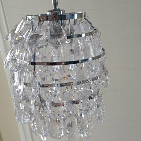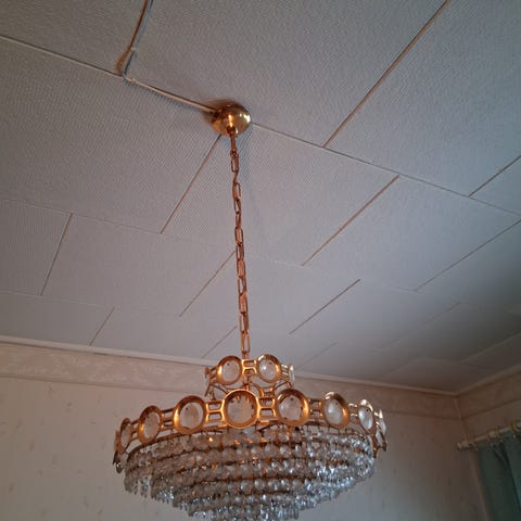 5 potin Kristalli valaisin, muutama Kristalli puuttuu, ei huomaa käytössä.n. 45 cm halk. Imatra/mansikkala.