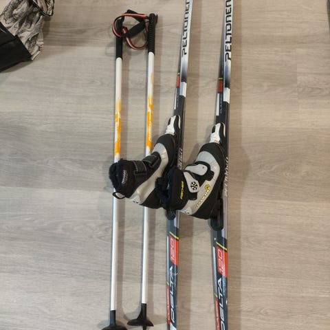 Lasten suksipaketti 120 cm perinteiseen hiihtoon voiteluvapaalla pitopohjalla.