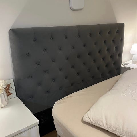 Jotex sängynpääty, samettimainen verhoilu harmaassa sävyssä. Sängynpäädyssä on napitettu, pehmustettu pinta, joka antaa selälle tuen istuttaessa sängyssä. Sopii sijoitettavaksi sängyn ja seinän väliin makuuhuoneessa. Koko: 160cm leveä. Erinomaisessa kunnossa. OVH 360€