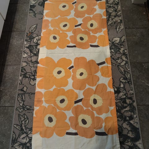 Marimekko, Pieni Unikko, kankaasta ommeltu kappa, korkeus 60cm, josta tankokujan osuus 7.5 cm, leveyttä kapalla on 198 cm. Tämä värisävy on tämän vuoden uusi sävy, päärynä, valkoinen, meloni.