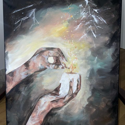 Minun maalaama taulu, jossa on esitetty keltainen aurinko ja tumma kuu tummalla taustalla. Maalaus on toteutettu akryyliväreillä kankaalle. Taustalla näkyy tummia pilviä ja taivas, etualalla yksityiskohtaisesti maalattu aurinko kasvonpiirteineen. Sopii seinäkoristeeksi esimerkiksi olohuoneeseen, makuuhuoneeseen tai työtilaan.