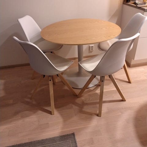 Myydään kovassa käytössä ollut neliön mallinen ruokapöytä + 8 kpl Askon pinnatuoleja. Pöydän pinta kulunut ja tuoleissa myös pieniä käytönjälkiä. Yleisilme ryhmälle kuitenkin siisti.