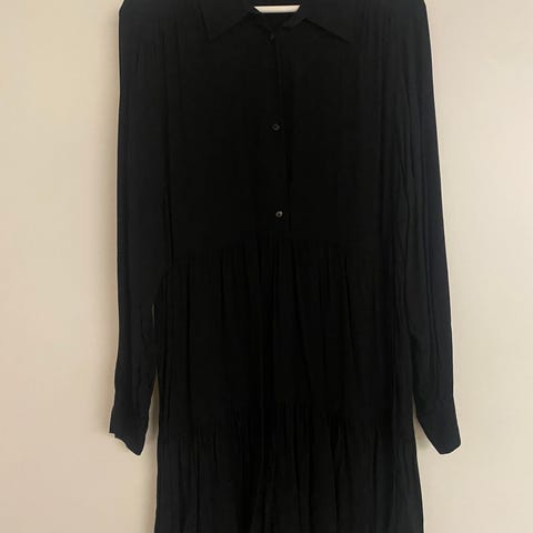 Mekossa on röyhelöolkaimet, joustava yläosa ja kerroksittain laskeutuva helma.