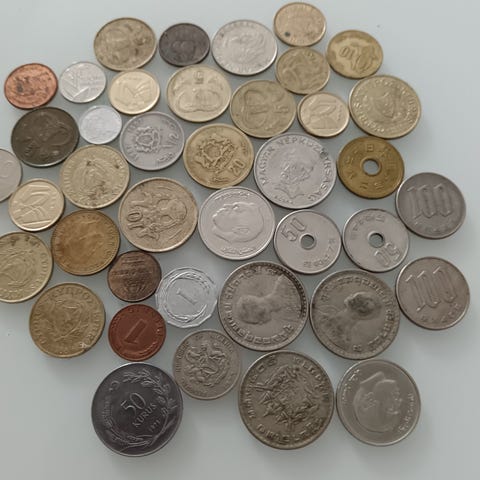 Sekalainen ulkomaisten kolikoiden erä. Kokoelmassa useita eri maiden ja nimellisarvojen kolikoita eri metalleista (mm. kupari-, messinki- ja hopeanvärisiä kolikoita). Soveltuu esimerkiksi keräilyyn, opetuskäyttöön tai rekvisiittaan. Myydään yhtenä eränä kuvien mukaisesti.Yhteen 2€
