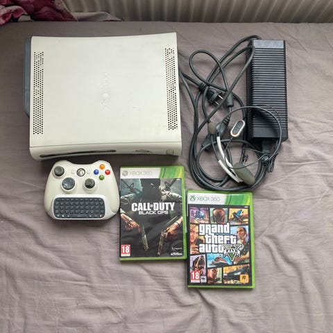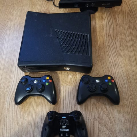 Microsoft Xbox 360 pelikonsoli ja useita Xbox 360 -pelejä. Kuvatun setin mukana tulee ohjain, Guitar Hero -kitara sekä useita eri genrejä edustavia pelejä, kuten urheilu-, ajo-, musiikki- ja toimintapelejä. Pakkauksissa näkyvät pelit ja tarvikkeet kuuluvat kokonaisuuteen kuvien mukaisesti.settiin kuuluu myös Skylanders peli+hahmoja n.10-15kpl.