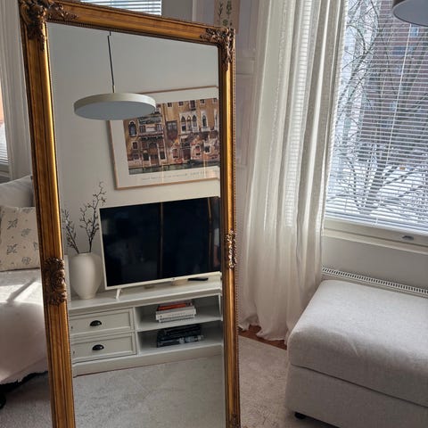&Tradition kokovartalopeili, jossa kapea kultainen kehys. Peili on suorakaiteen muotoinen ja soveltuu esimerkiksi eteiseen, makuuhuoneeseen tai vaatehuoneeseen. Voidaan käyttää seinään nojaavana tai seinälle kiinnitettynä tilan ja tarpeen mukaan.