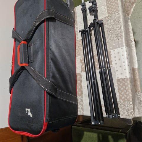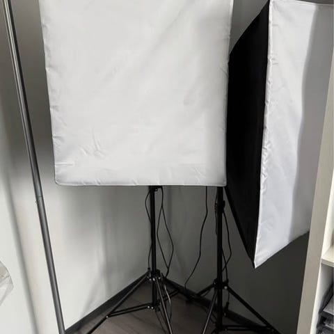 Kolme kantopussiin taiteltavaa softbox-valaisinta ja neljä 135W isoa lamppua niihin.