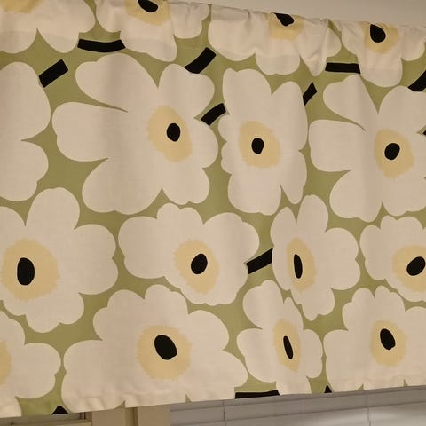 Marimekko Unikko kangas. Kuosissa on suuria valkoisia kukkia vaaleanvihreällä pohjalla ja vaaleankeltaisilla keskustoilla. Materiaali puuvilla patalappu mukaan