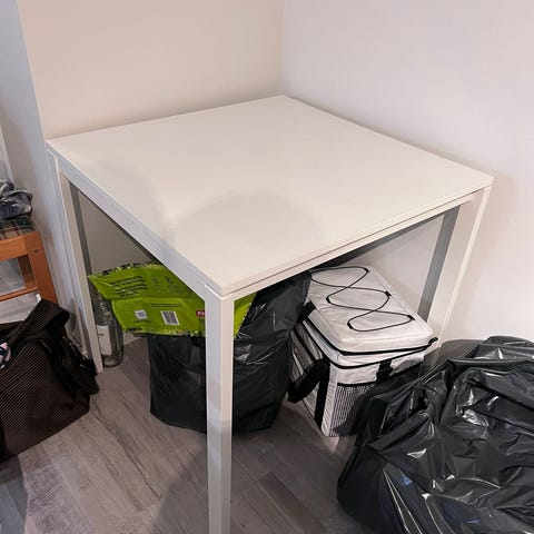 Annetaan Ikean Docksta-pöytä, jota on säilytetty ulkona 1,5v. Ollut nyt viimeiset 6kk käytössä asuessamme remonttievakossa. Pöytäliinalla saa kolhut piiloon. Pöytälevyssä on turpoamista kohdassa, joka on ollut terassin lattiaa vasten. Jalkaosassa ei ole isompia naarmuja tms. Pöytä ei haise homeelle tms.