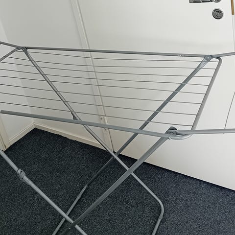 Valkoinen metallinen pyykkiteline sisäkäyttöön. Telineessä on useita poikkirimoja pyykin kuivaamista varten ja se on taitettava, joten sen saa tarvittaessa helposti kasaan säilytystä varten. Soveltuu esimerkiksi vaatteiden ja liinavaatteiden kuivaamiseen kotona.