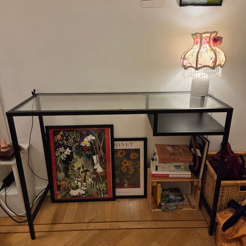 Musta työpöytä puutasolla ja metallisilla jaloilla. Vakaa ja naarmuton.
