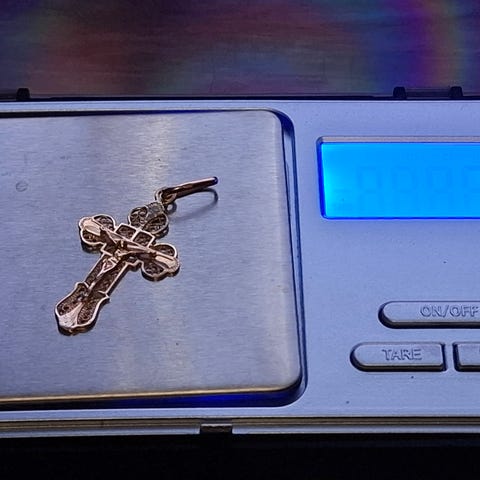 Yli 30 vanha kultainen ristiriipus, jota ei ole koskaan käytetty. Käy siis myös lahjaksi. Paino talousvaa'lla 3-4 g. Romuna arvo siis noin 250 €. Siksi hinta on tiukka.