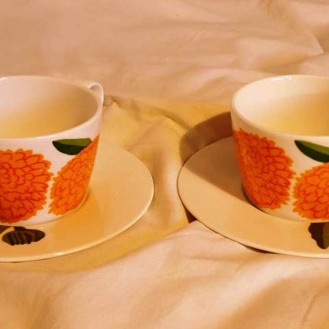 Kaksi mukia ja aluslautasta hintaan 20e/kpl.