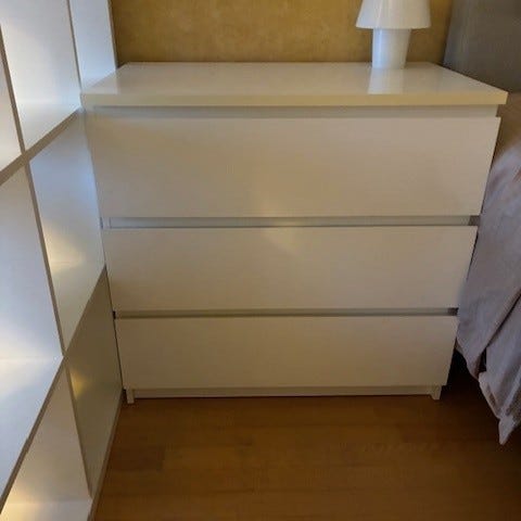 3 kpl Ikean valkoisia 3 laatikollisia MALM Lipastoja lasikannella. Lipastot ovat usean vuoden vanhoja, ja auringon hieman kellastamia. 15€ kpl.