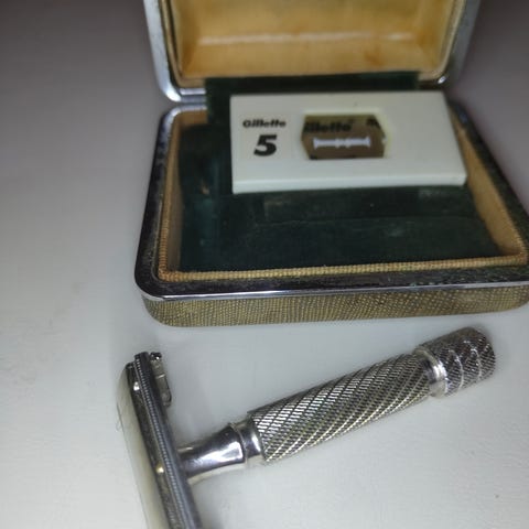 Kuvien mukainen vintage Gillette Made In England partahöylä, ja sen kaveriksi terän teroitin.