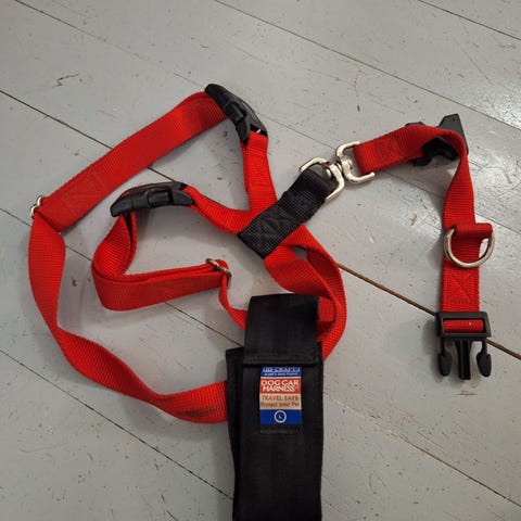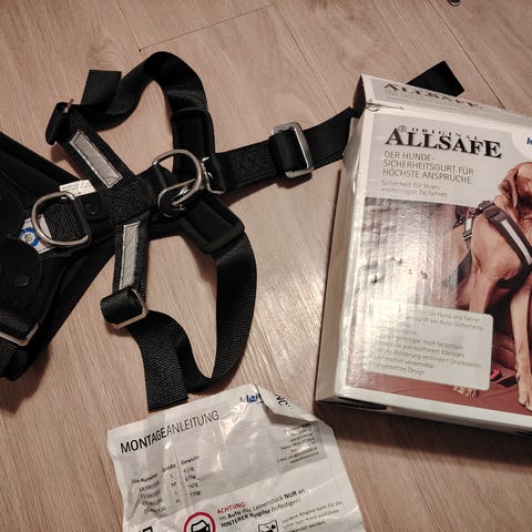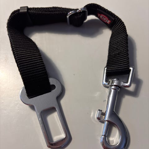 Mukana tulee kiinnitin, jolla koiran voi kiinnittää suoraan auton turvavyöhön.