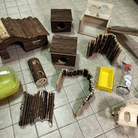 Dunan mitat 29 cm (kork.), 71 cm (leveys), 46 cm (syvyys). Juoksupyörän halkaisija 19,5 cm. Mukaan tulevat kuvissa näkyvät tavarat. Puisessa mökissä purujälkiä ja "yläkerta" irtoaa paikaltaan. Mukaan tulee avaamaton pesäpurupussi.