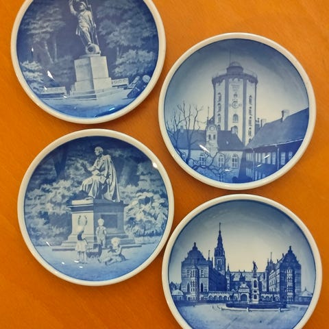 Royal Copenhagen Denmark 2010 pienet seinälautaset: Langelinie (pieni merenneito, Storkerede, Dansk landskab ja Kongens Nytorv. Halkaisija 8,5 cm. Pientä pintakulumaa ja Storkerede lautasen posliinipinta on krakeloitunut (katso neljä viimeistä kuvaa). Yhteishinta.