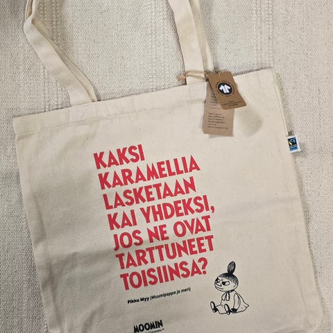 Moomin muumiaiheinen pussukka vaikka yöasuille. Siisti, laputkin vielä kiinni. Kokonaiskorkeus n.48cm, korvat mukaanlukien.